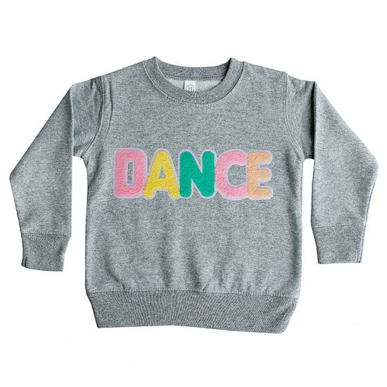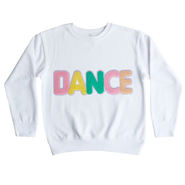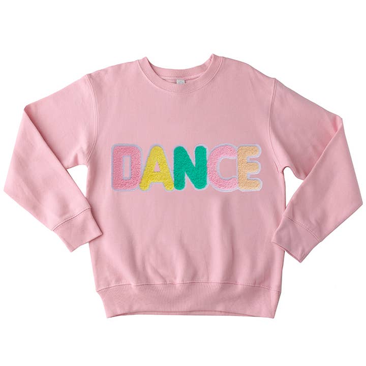 Cute Sweatshirt with Colorful pastel DANCE Chenille Patch. So fun for year round for those girls who love dance. Paired great with any of our tutus, hats, necklaces, bracelets, headbands, and clips. Make your own outfit and make it your own!