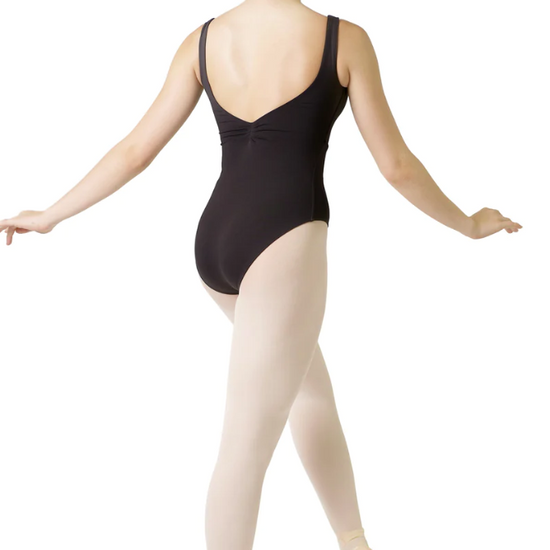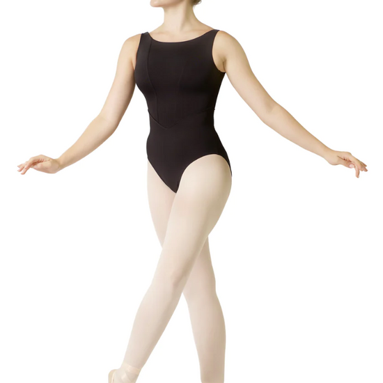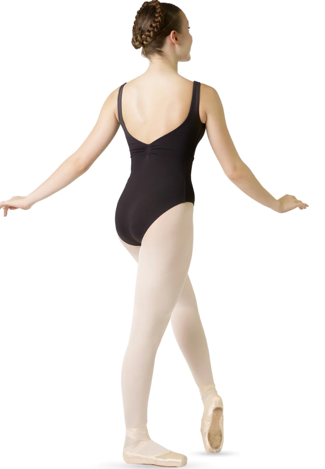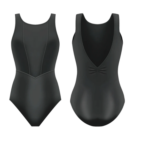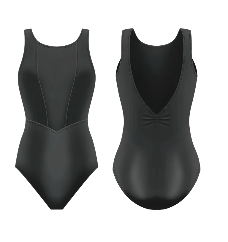 - Mid-section 'V' drawing the line of the leotard in, focusing on the narrowest part of the body, resembling the structure of a corset