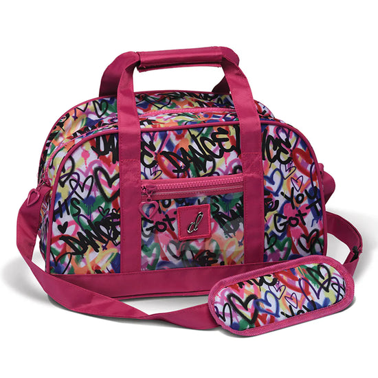 Hearts dance graffiti printed nylon duffel bag includes spacious fully lined main compartment with front zipper pocket and top zip closure. Also includes webbed handles, a padded shoulder strap, front outside pocket, and cute heart zipper pulls. This sturdy bag has our DANZNMOTION “d” logo icon. Wipes clean, is lightweight and folds flat.