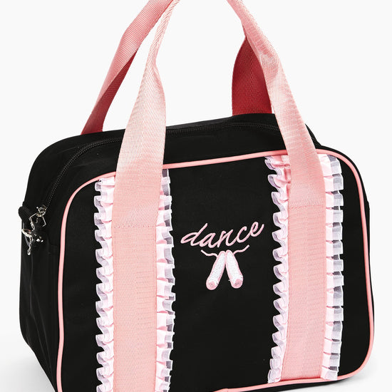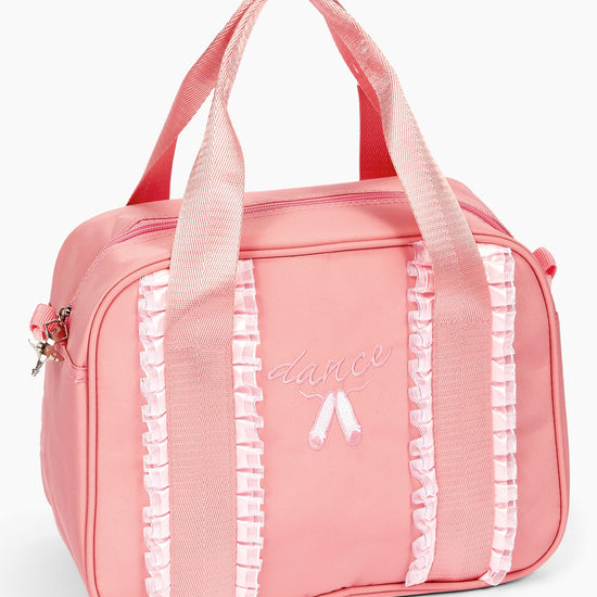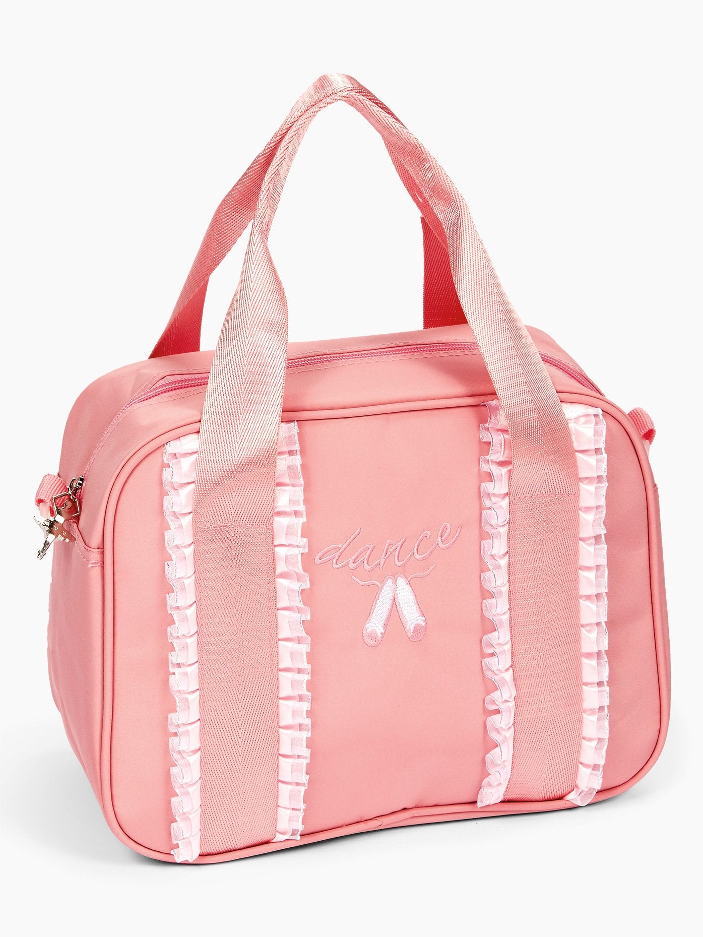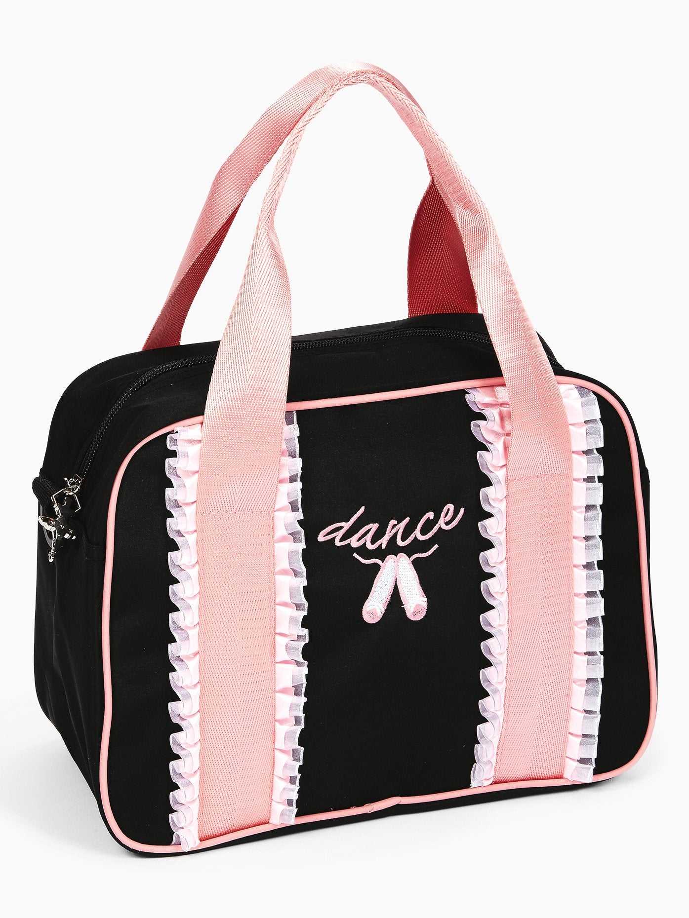 A small duffle for young girls with the word “dance” inscribed in pink with a pair of stitched ballet slippers. The straps are 1.5” thick grosgrain ribbon with pink polyester ribbon ruffles along the front. The zipper features a silver ballet dancer charm and also comes with a detachable shoulder strap.