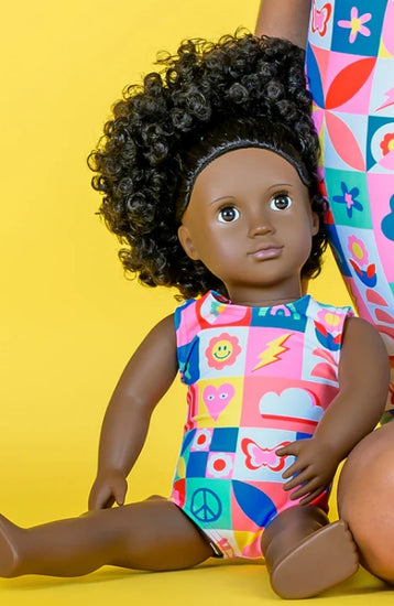 Check out this adorable doll leotard to match your gymnast's Color Me Happy gymnastics leotard or biketard. This quality leotard sewn just like hers fits most 18" dolls! Need help finding a matching doll leotard set? Contact us at support@destira.com or click here to see all the matching leotards!