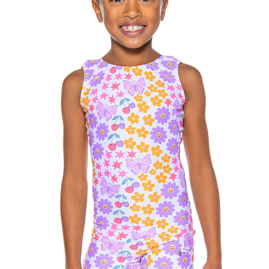 Jump into warmer weather and springtime vibes in Daisy Smile. 🌼 Made with our signature soft material, this girls' gymnastics unitard features smiling and yellow daises, purple butterflies, gold stars, and pink and purple cherries. A bright, joyful unitard made with our smooth, soft fabric!
