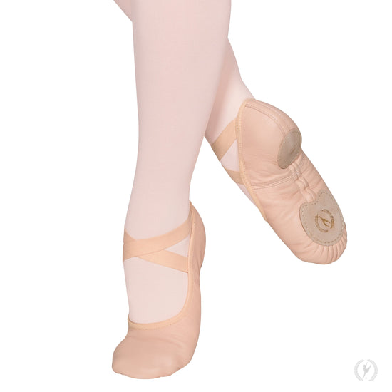 This premium leather adult ballet shoe is ready-to-wear with a pre-sewn, crisscross elastic and a soft, drawstring free elastic binding. The full grain leather uppers contour effortlessly to the shape of the foot for exquisite lines and supreme comfort. A hidden elastic casing that connects the suede sole patches keep the shoe snugly on the foot while beautifully highlighting the arch. Eurotard's signature flattened, elongated metatarsal pleating improves the fit, feel, and look of the shoe without having any bumps or bulges underneath the toes.