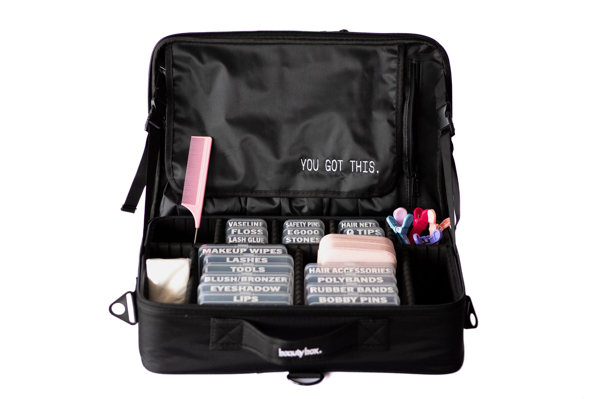Elevate your performance prep with the official From the Top Beauty Box! This sleek black case is designed to keep you organized and ready to shine. Fully zipped with two spacious compartments, it houses 19 dedicated containers for all your essentials—makeup, hair accessories, Q-tips, stoning tools, and more.