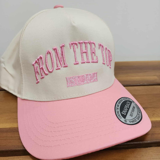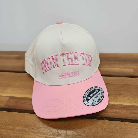 This trendy two-tone cap features a soft cream crown with a pink bill and bold “FROM THE TOP” embroidery across the front — a perfect blend of cute and classic. Made from durable, high-quality fabric, it’s designed for everyday wear with a comfortable fit and adjustable snapback closure.