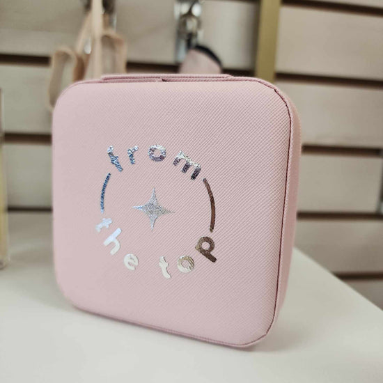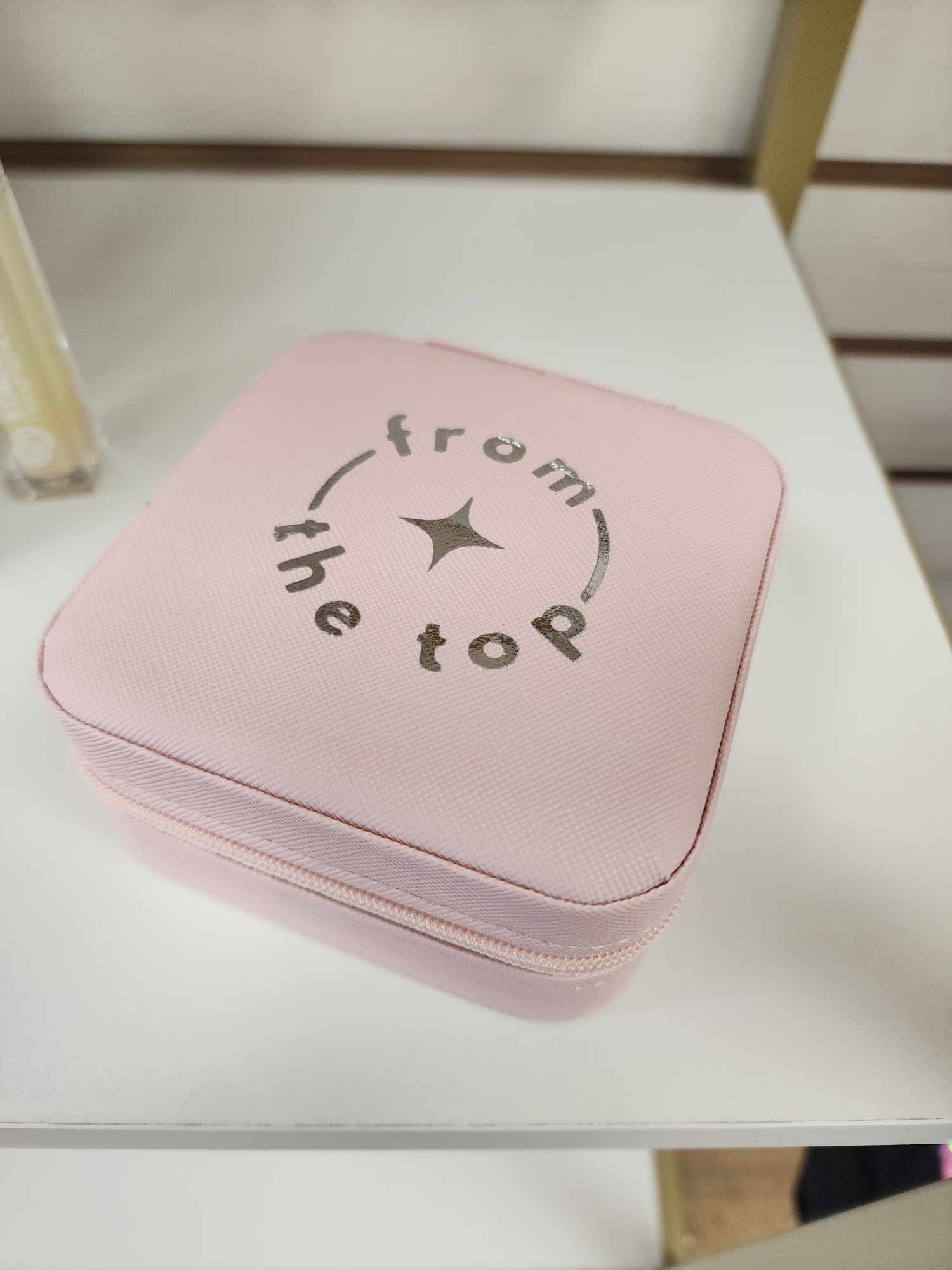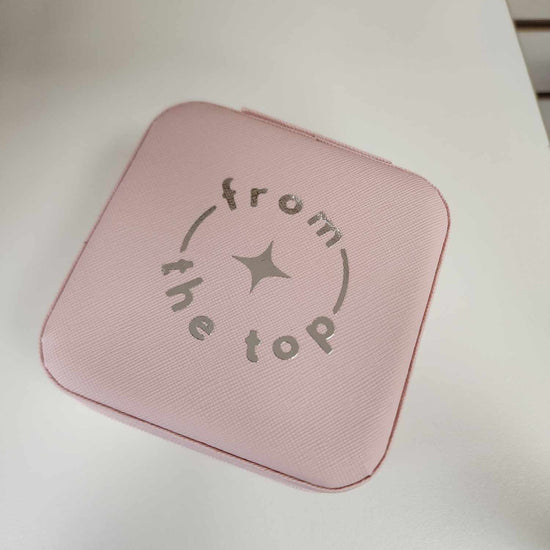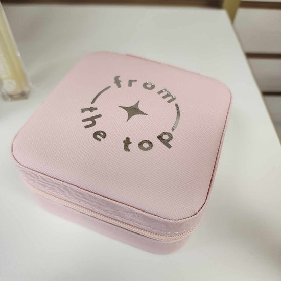 Introducing the From the Top Jewelry Box—a stylish and practical solution for performers who need to travel with their accessories! This elegant jewelry organizer features a pink faux leather exterior with a full zipper closure and our signature From the Top logo in sophisticated silver foil.