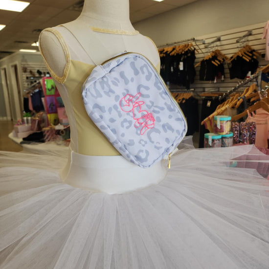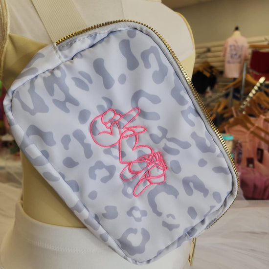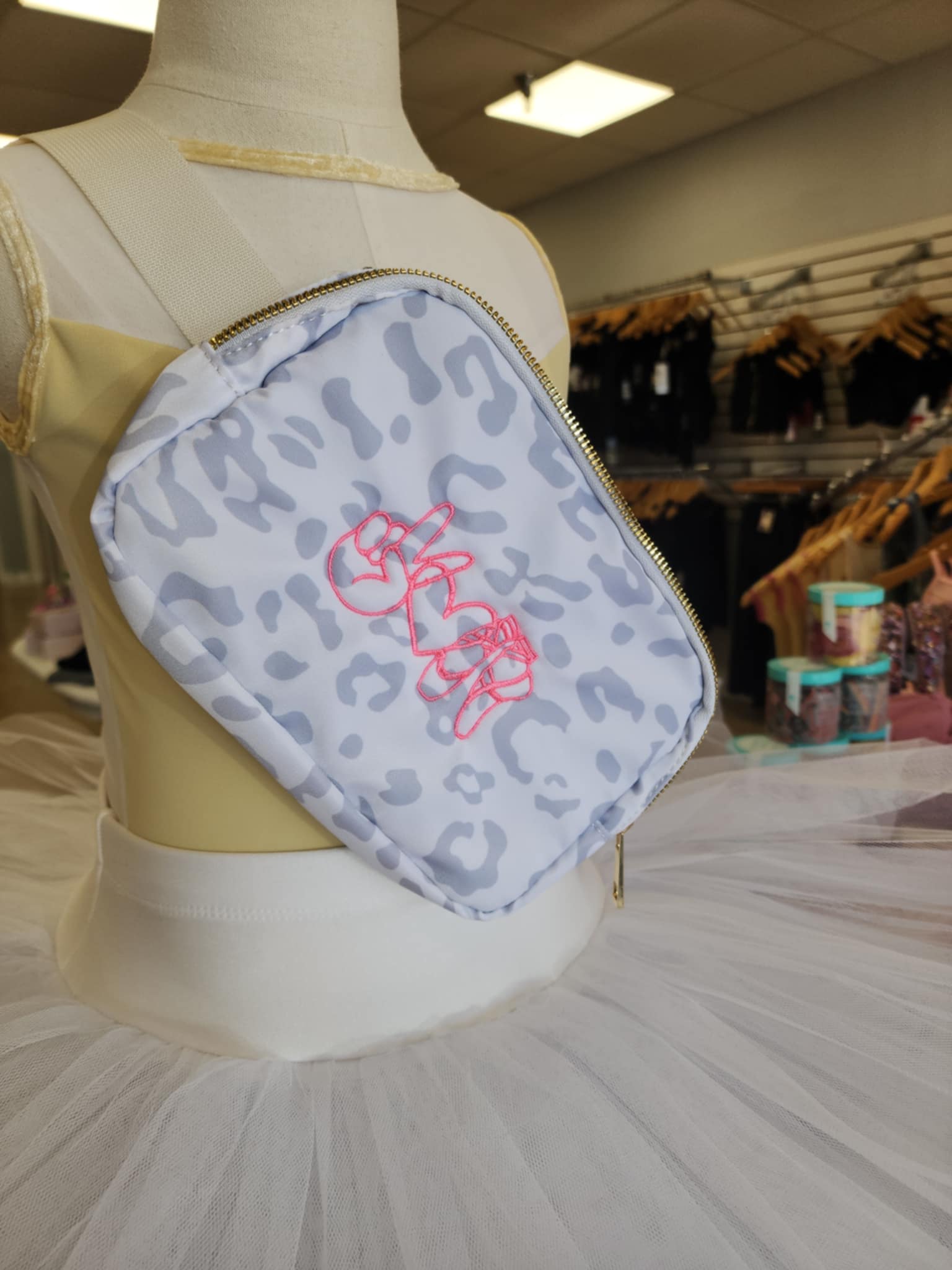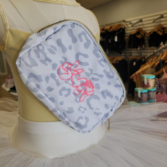 Chic, bold, and made for movers! Our exclusive From the Top belt bag features a light grey cheetah print and vibrant hot pink “Peace Love Dance” embroidery—perfect for dancers, cheerleaders, and performance lovers on the go.