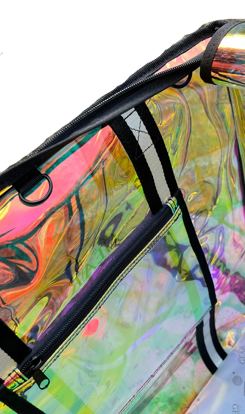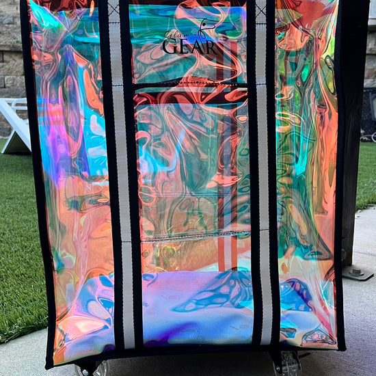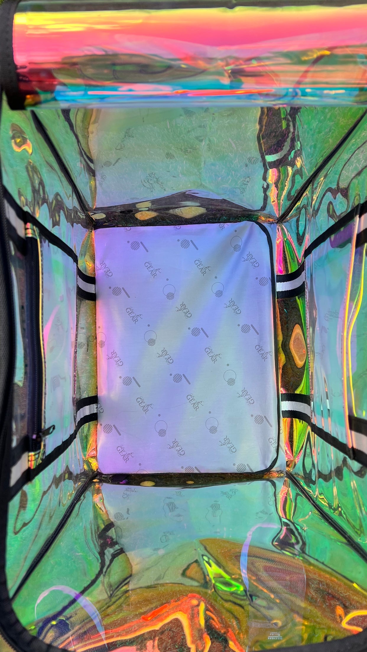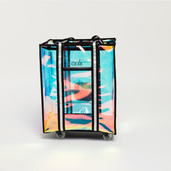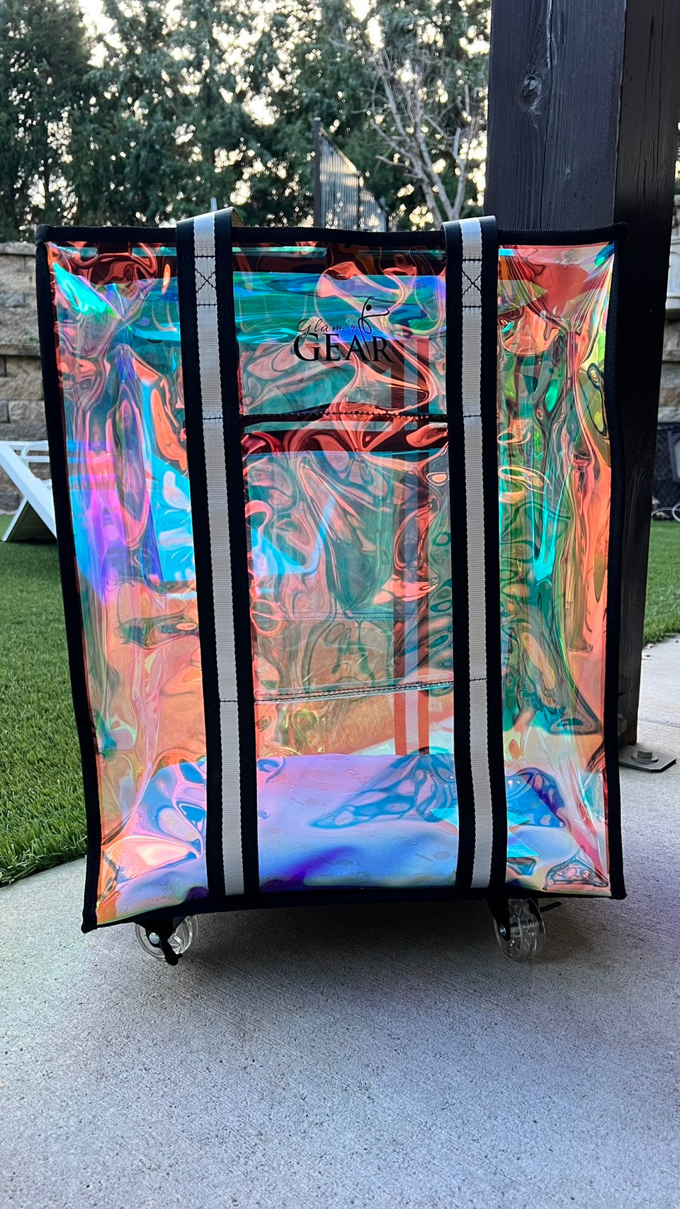 Crafted from a show-stopping semi-transparent iridescent material that catches light and turns heads, this bag doesn’t just carry your essentials – it carries vibes. With a durable build and smooth-gliding wheels, it effortlessly combines style, strength, and function.