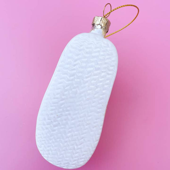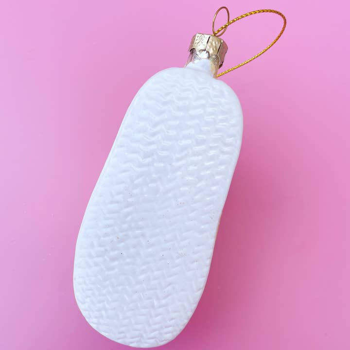 A smiley face slipper Christmas ornament with glitter details, the perfect way to add a bit of sweetness to your tree. Hand Blown Glass 4" *All ornaments are handmade for us and will have slight differences. This variability is part of what makes our handmade ornament special.