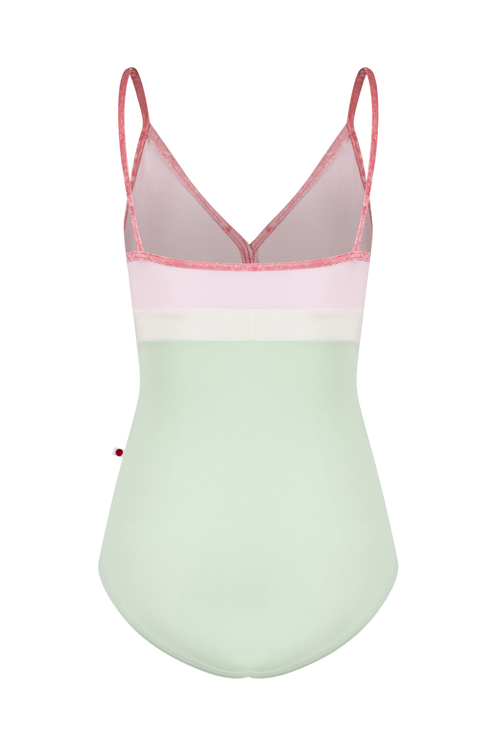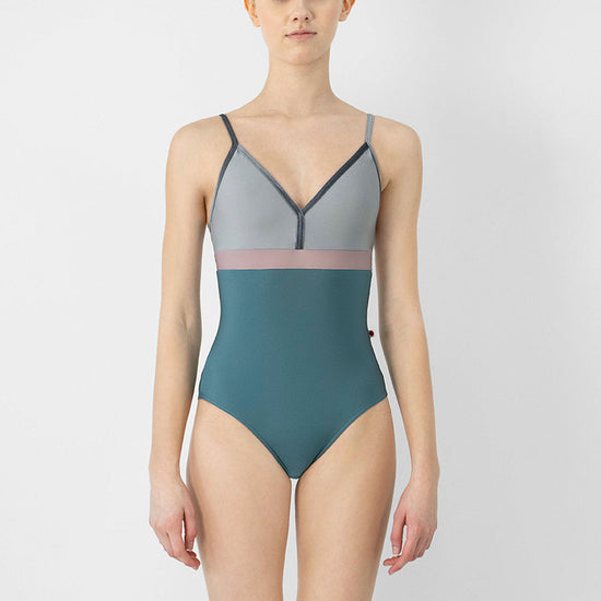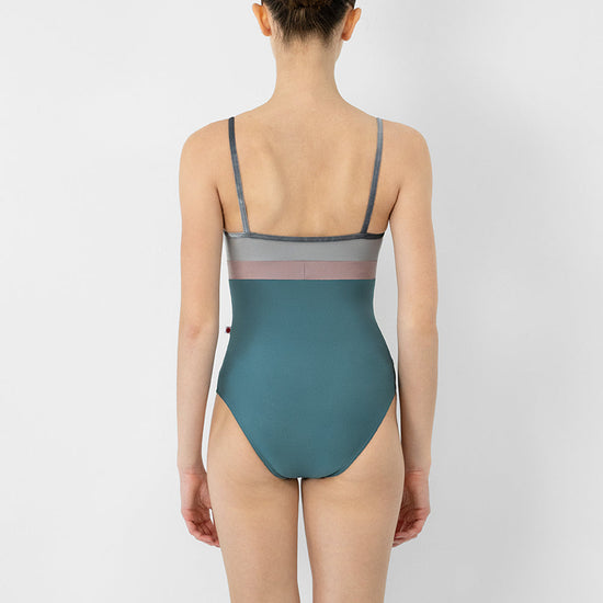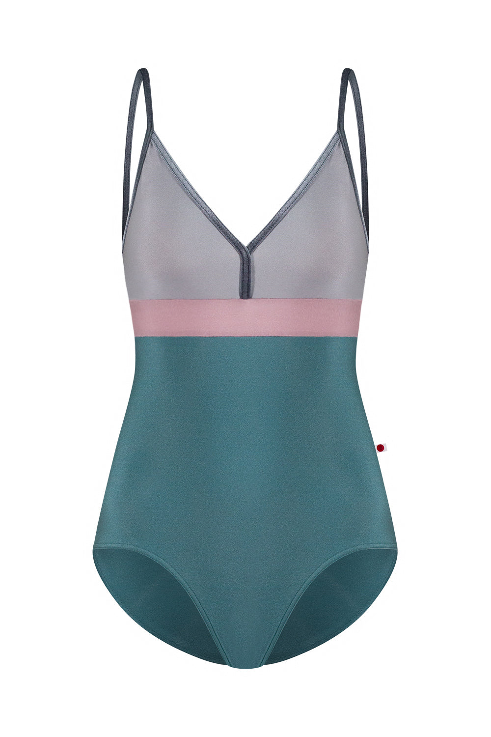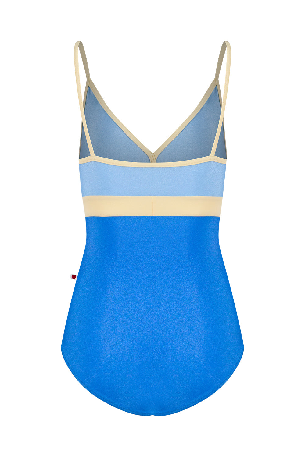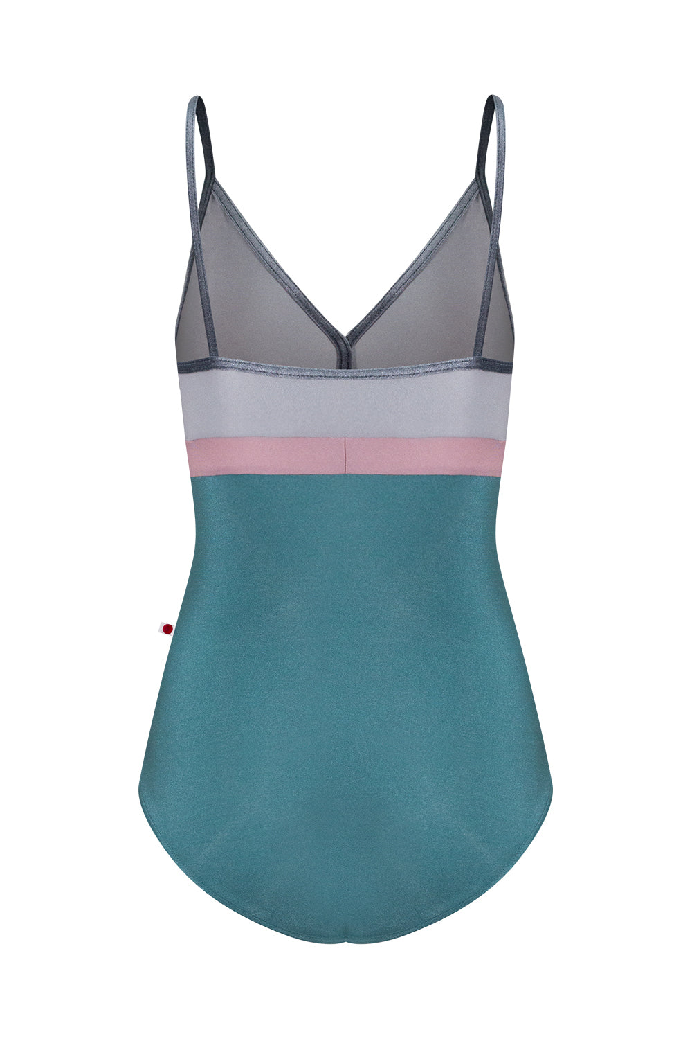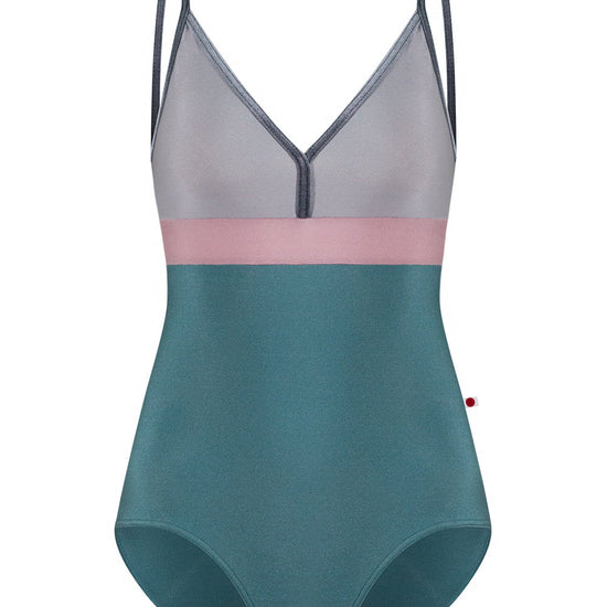 The Zoe leotard has retro appeal with a color-block empire waistband and v-neckline.