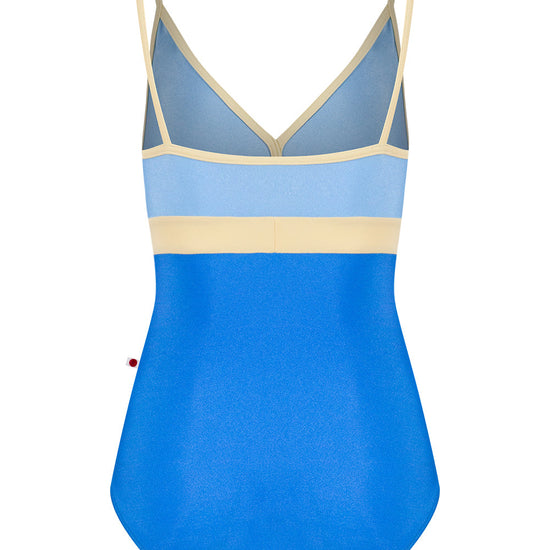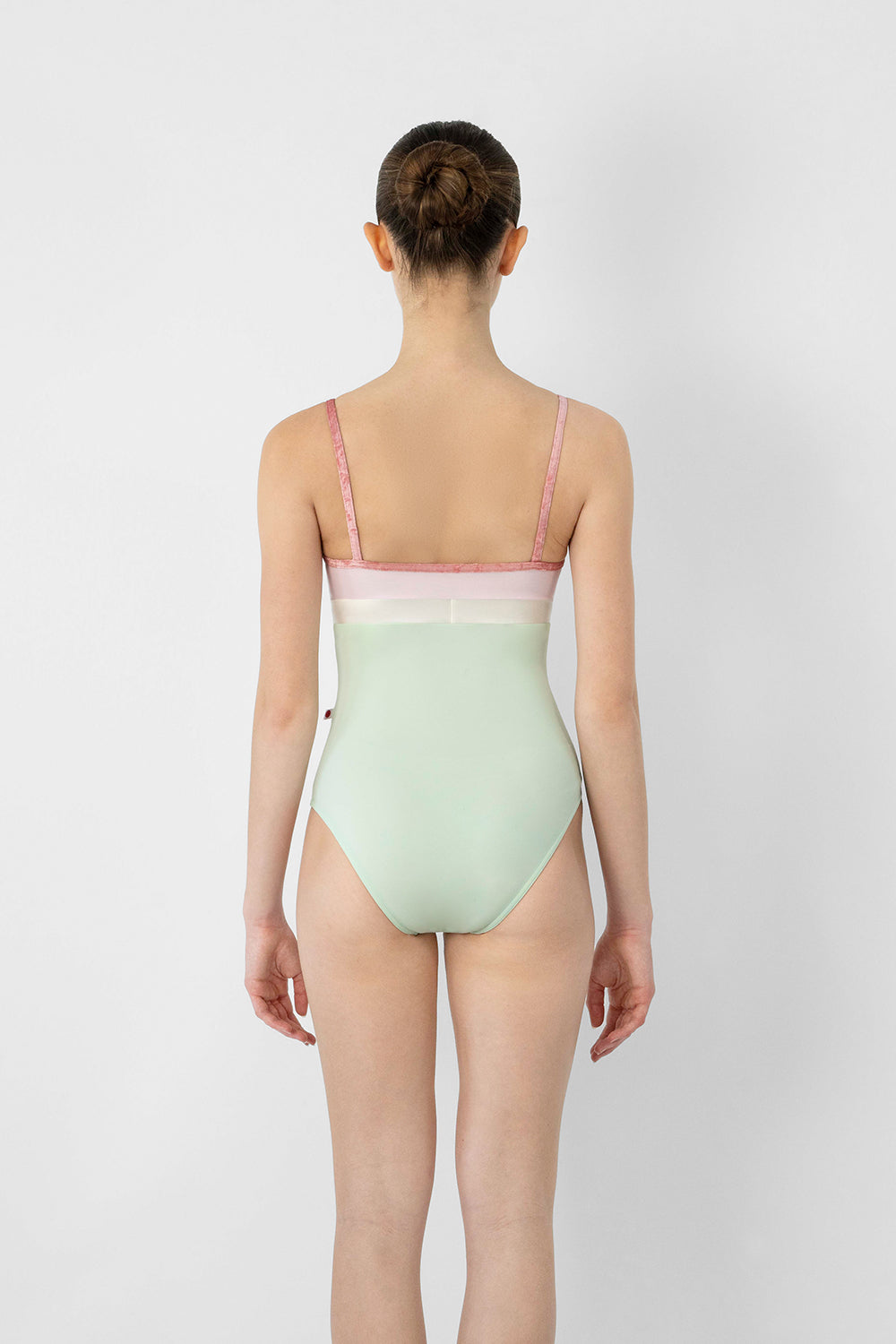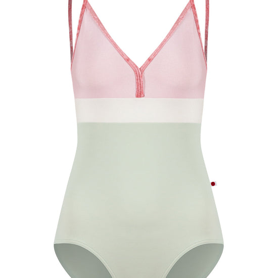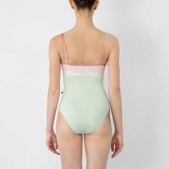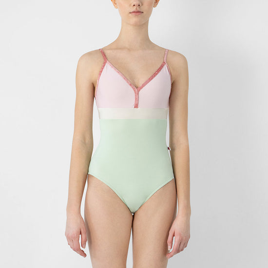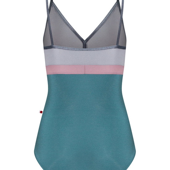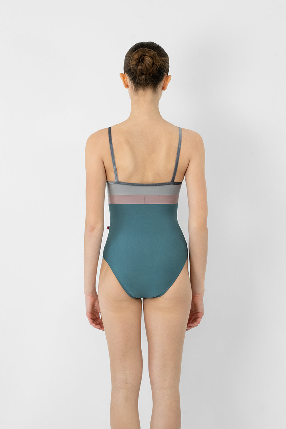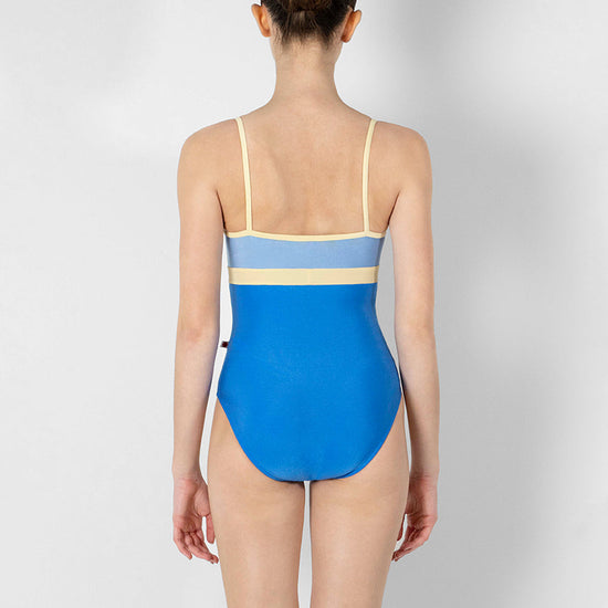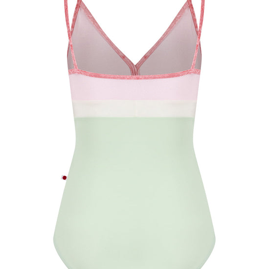 The Zoe leotard has retro appeal with a color-block empire waistband and v-neckline.